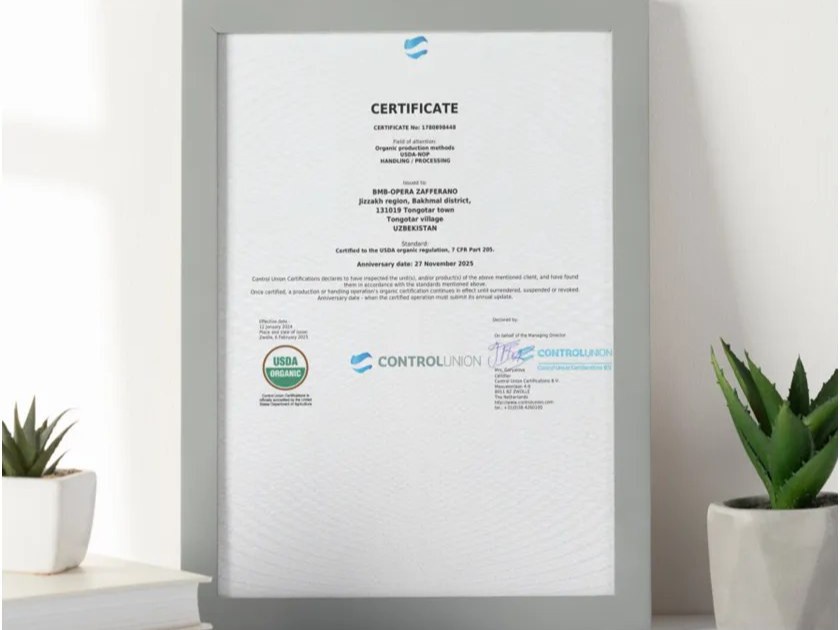 Oʻzbekistonning BMB ZAʻFARON kompaniyasi Niderlandiyaning nufuzli Control Union Certifications tashkilotidan olgan USDA ORGANIC sertifikatining amal qilish muddatini uzaytirib, oʻz mahsulotlari yuqori xalqaro standartlarga muvofiqligini yana bir bor tasdiqladi.