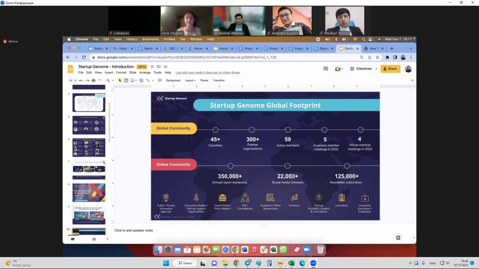 Joriy yilning 7-dekabr kuni Innovatsion rivojlanish vazirligi Startap ekotizimini shakllantirish va rivojlantirish boshqarmasi “Startup Genome” global tashkiloti vakillari bilan hamkorik oʻrnatish yuzasidan uchrashuv tashkillashtirildi.