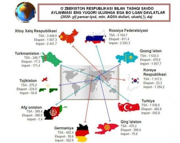 Oʻzbekiston Respublikasi Davlat statistika qoʻmitasi bergan maʼlumotga koʻra, 2020-yilning yanvar-iyul oylari yakuni boʻyicha Oʻzbekiston Respublikasining tashqi savdo aylanmasi (TSA) 19 544,2 million AQSH dollarini tashkil etib, 2019-yilning mos davriga nisbatan 4 659,2 million AQSH dollariga yoki 19,3 foizga kamaygan.