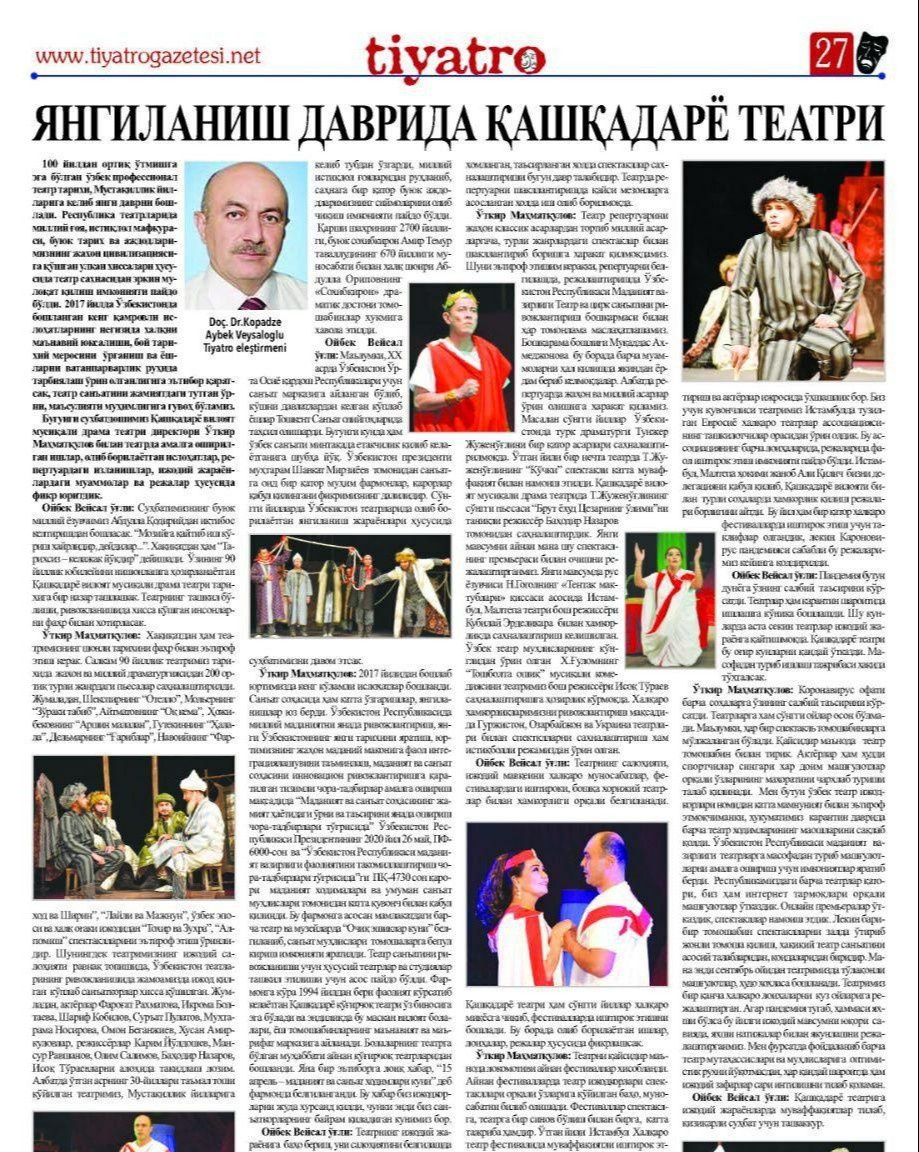 Turkiyaning «TIYATRO» gazeta-jurnalidagi katta maqola yurtimiz Mustaqilligining 29 yilligini nishonlashda o'ziga xos tuhfa bo'ldi.