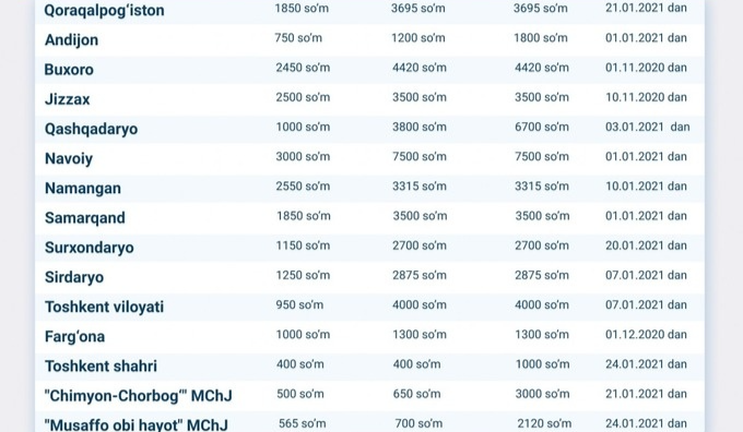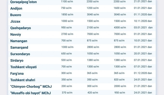 «Yangi tariflarga koʻra, Oʻzbekistonda ichimlik suvi va oqova suv xizmatlarining yangi narxlari oʻrtacha 1,9 foizga oshgan, deyiladi xabarda. Oʻz navbatida, ayrim hududlarda tariflar 1,5−3 baravarga oshgan. Suv hisoblagichlar bilan taʼminlanmagan isteʼmolchilarga hisob-kitoblar suv isteʼmoli meʼyorlaridan kelib chiqib hisoblanadi.