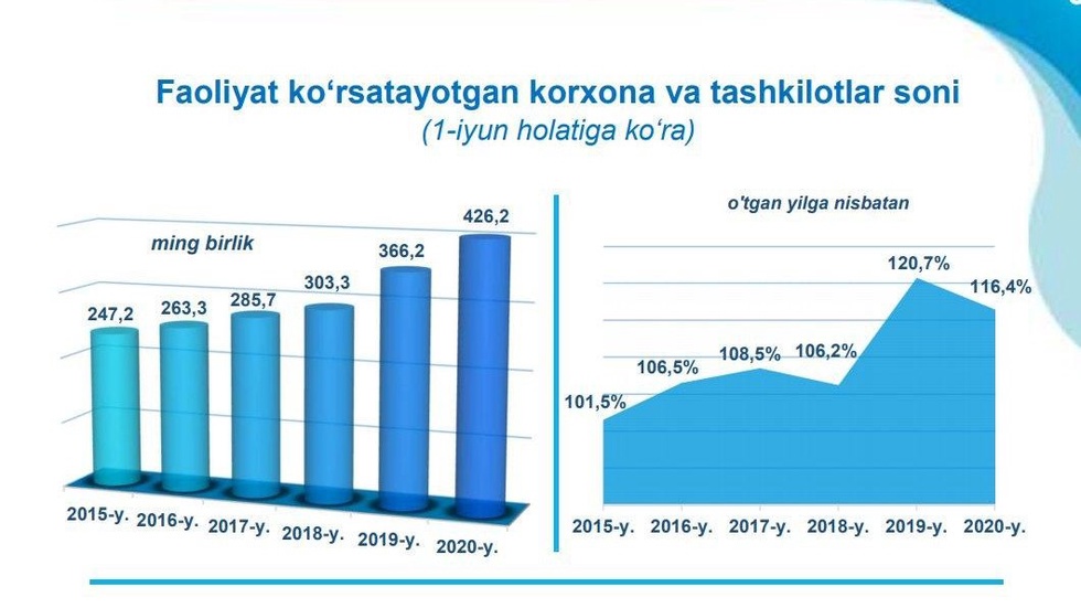 Unga ko'ra, joriy yil 1 iyunga qadar mamlakatimizda 37 940 ta yangi korxona tashkil etilib, 453 386 ta korxona davlat ro'yxatidan o'tkazilgan.