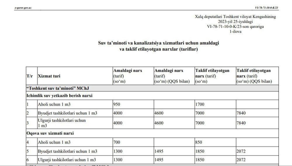 “Toshkent suv taʼminoti” korxonasi abonentlari uchun aholiga suvning kubometri tarifi 950 soʻmdan 1700 soʻmga (QQSsiz), byudjet va ulgurji tashkilotlari uchun 4000 soʻmdan 7000 soʻmgacha oshiriladi (Narxlar qoʻshimcha qiymat soligʻisiz koʻrsatilgan)