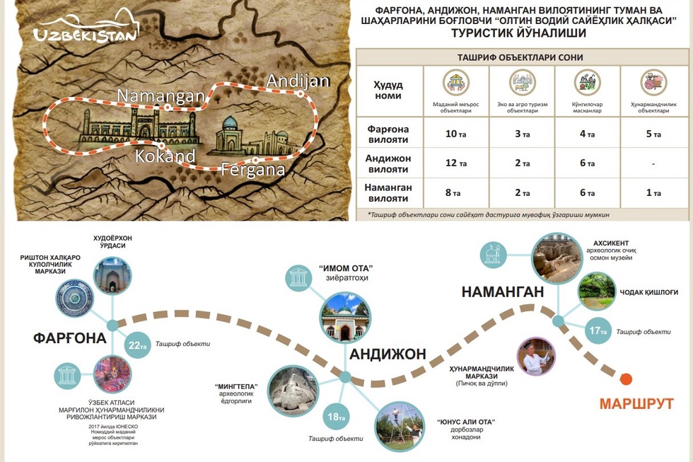“Oltin vodiy sayyohlik halqasi” turistik yoʻnalishi jami Fargʻonada 22 ta, Andijonda 18 ta va Namanganda 17 ta tashrif obyektlarini oʻz ichiga olgan.