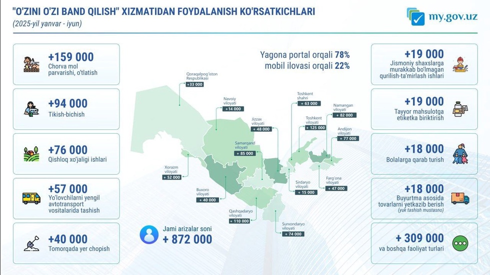 Barcha arizalarning 78 foizi my.gov.uz portali orqali, qolgan 22 foizi esa mobil ilovalar orqali topshirilgan.