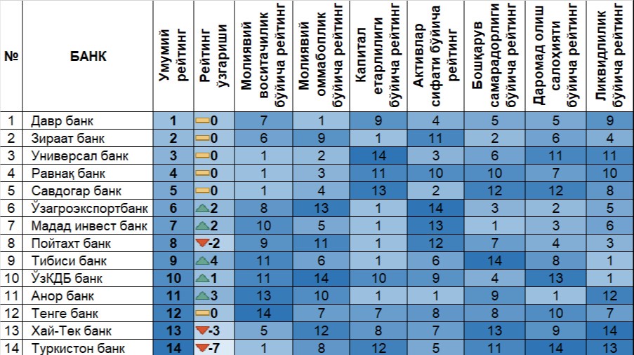 Bu yil  birinchi chorakda Mikrokreditbank va O'zsanoatqurilish bank umumiy reytingda ko'tarilishga erishdi. Ushbu banklar o'tgan yilning to'rtinchi choragidagi pozitsiyasidan to'rt pog'ona yuqoriladi.