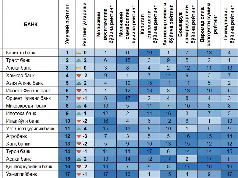 17 ta yirik bank orasida Kapitalbank o'tgan yilning ikkinchi choragidan buyon etakchilikni saqlab qolmoqda. Kapital etarliligi, daromad olish salohiyati va boshqaruv samaradorligi bo'yicha yuqori natijalar Kapitalbankka umumiy reytingda o'z o'rnini mustahkamlashga yordam berdi.
