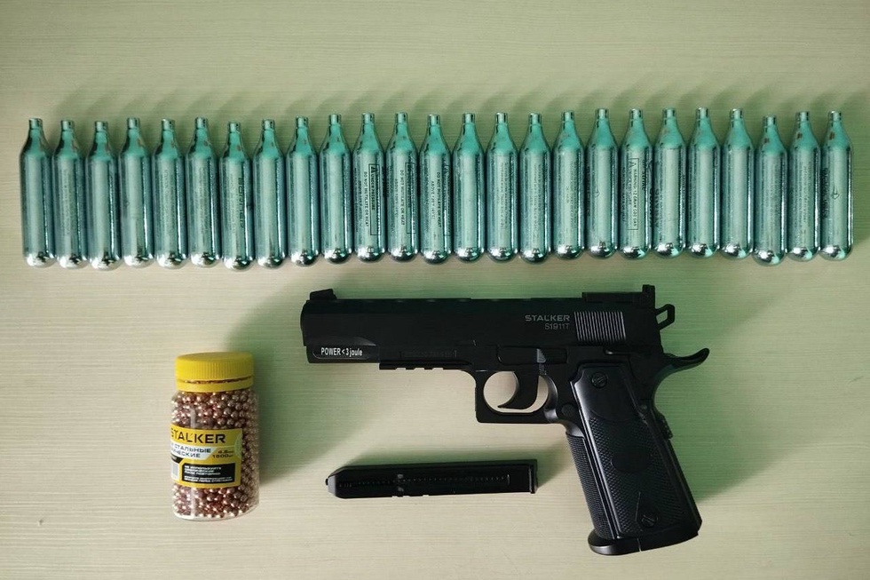 Bojxona nazorati davomida fuqaroga tegishli qora rangli sumka ichidan yoʻlovchi bojxona deklaratsiyasida yozib koʻrsatilmagan, bojxona xodimining ogʻzaki soʻrovida maʼlum qilinmagan, tegishli ruxsatnomalarga ega boʻlmagan 1 dona 4.5 mm.li “Stalker” nomli pnevmatik toʻpponcha, 25 dona pnevmatik toʻpponcha gaz ballonlari hamda 1482 dona pnevmatik toʻpponcha oʻqlari borligi aniqlandi.