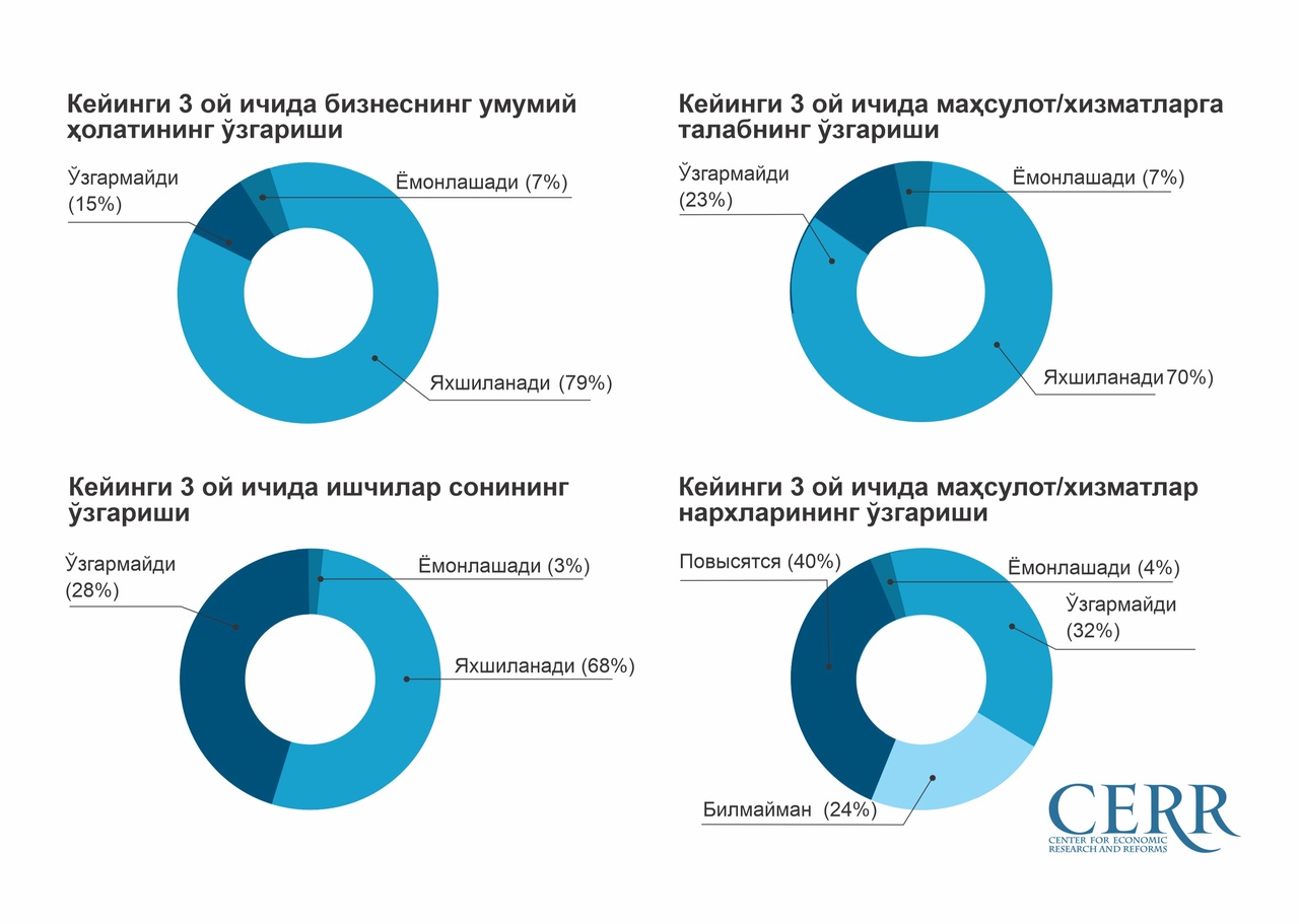 Tadbirkorlarning 81% o‘zlarining biznes istiqbollari yaxshilanishiga ishonishadi. 73% korxonalarda tovar va xizmatlarga bo‘lgan talab yaxshilanishi, respondentlarning 65% ishchilar sonining ko‘payishini kutmoqda.