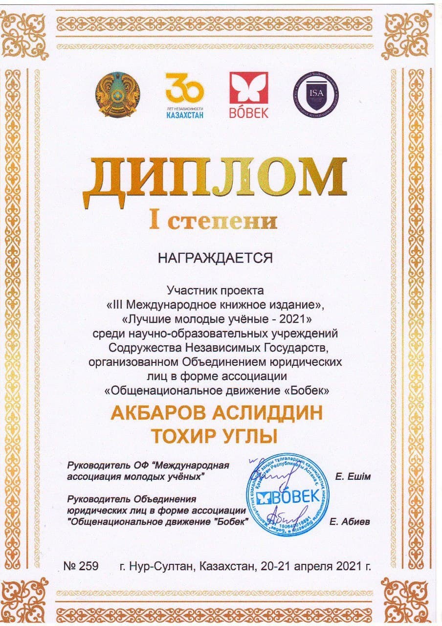 Murakkab pandemiya sharoitiga qaramay, yurtimiz va xalqaro miqyosda oʻtkazilayotgan turli tanlovlar yoshlarning ilmiy izlanishlarini ragʻbatlantirib, ularning faoliyatida motivatsiya boʻlib xizmat qilmoqda. Joriy yilning aprel oyida Qozogʻistonning Nur-sulton shahrida boʻlib oʻtgan “MDH yosh olimlari – 2021” xalqaro tanlovda MDHning 14 mamlakatidan turli yoʻnalishlarda ilmiy izlanishlar olib borayotgan mingdan ortiq iqtidorli yoshlar ishtirok etdi. Tanlov natijalariga koʻra Asliddinning ilmiy ishlari qoʻlga kiritgan yutuqlari va tanlov davomidagi saralash jarayonlari hisobga olingan holda hakamlar tomonidan yuqori baholanib, tanlov ishtirokchilari orasida tibbiyotga oid eng yaxshi izlanish deb topildi va 1 oʻringa munosib koʻrildi.