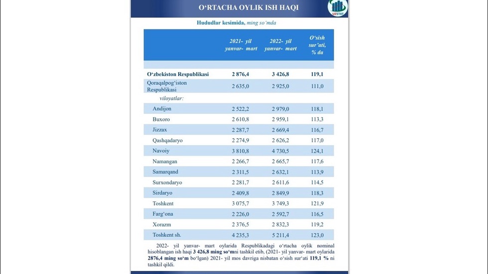 Ma'lumotga ko‘ra, 2022-yil yanvar-mart oylarida Respublikadagi o‘rtacha oylik nominal hisoblangan ish haqi 3 426,8 ming so‘mni tashkil etib, (2021-yilning yanvar-mart oylarida 2 876,4 ming so‘m bo‘lgan) o‘tgan yilning mos davriga nisbatan o‘sish surʼati 119,1 foizga yetgan.