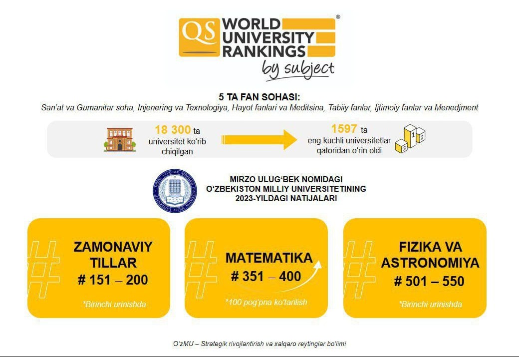 Unga koʻra, Oʻzbekiston milliy universiteti va “Toshkent irrigatsiya va qishloq xoʻjaligini mexanizatsiyalash muhandislari” Milliy tadqiqot universiteti 4 ta (zamonaviy tillar, matematika, fizika va astronomiya, atrof-muhit) fan boʻyicha TOP-500 oliy taʼlim muassasalari qatoridan oʻrin egalladi.