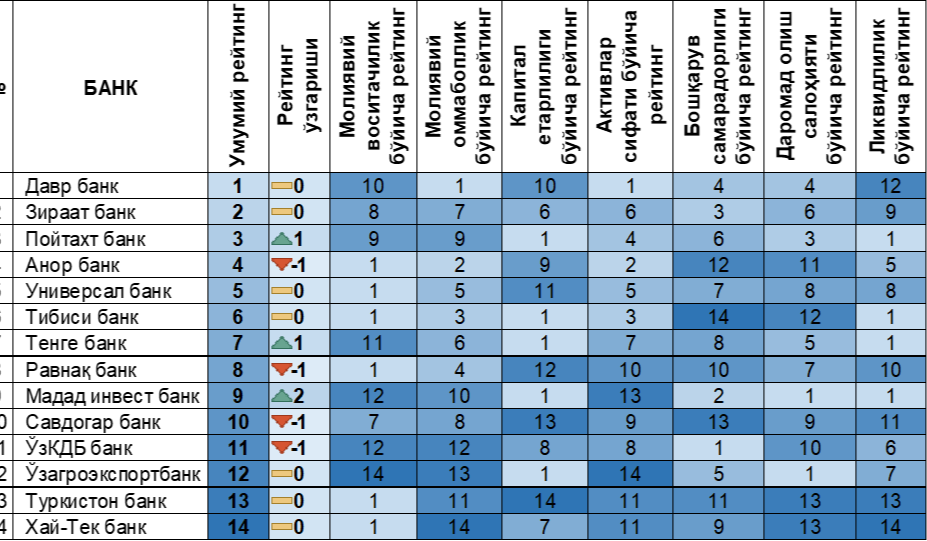 Oʻzbekistondagi 14 ta kichik banklari faollik reytingida Davrbank va Ziraat bank oʻz oʻrnini saqlab qoldi.