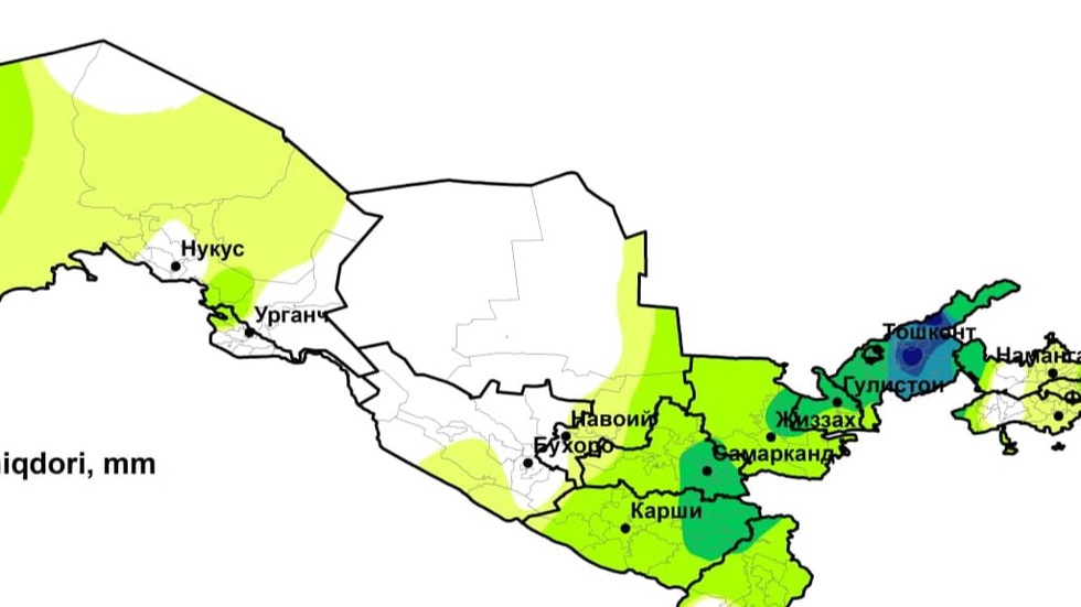 Xaritadan respublikaning Toshkent viloyatining ayrim hududlarida koʻp miqdorda yogʻingarchilik kuzatilganini koʻrish mumkin.