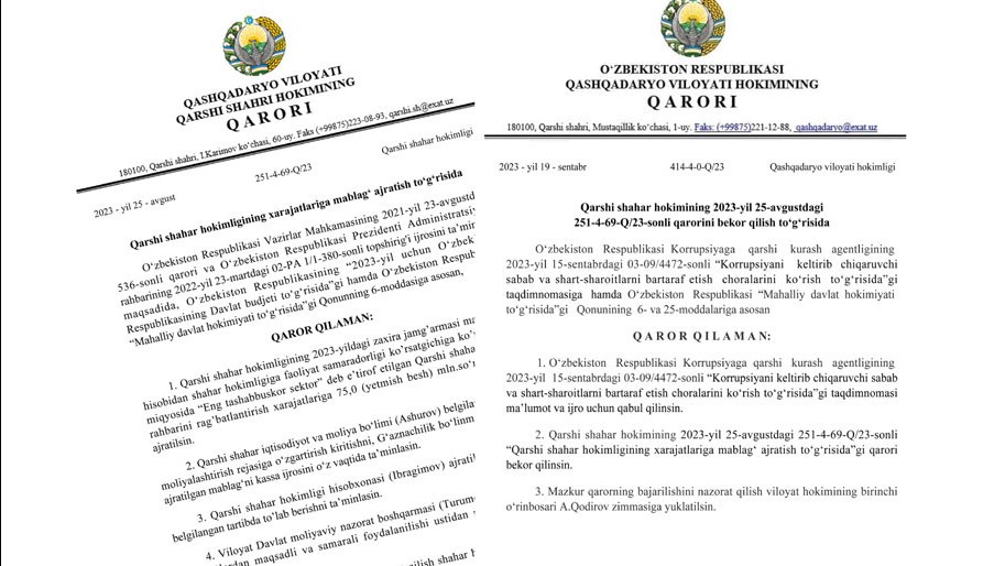 Viloyat hokimining joriy yil 19 sentyabrdagi qarori bilan O'zbekiston Respublikasi  Korruptsiyaga qarshi kurash agentligining 2023 yil 15 sentyabrdagi korruptsiyani keltirib chiqaruvchi sabab va shart-sharoitlarni bartaraf etish choralarini ko'rish to'g'risidagi taqdimnomasiga asosan Qarshi shahar hokimining 2023 yil 25 avgustdagi qarori bekor qilindi.