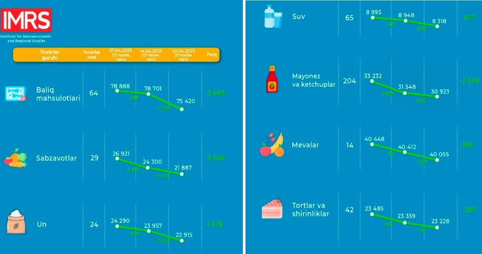 Natijalar shuni koʻrsatadiki, baliq mahsulotlari 14-aprelda 7-apreldagiga nisbatan oʻrtacha 188 soʻmga, 21-aprelda esa 7-apreldagiga nisbatan 3400 soʻmga, mevalar tegishli ravishda 36 soʻmga va 393 soʻmga, tort va shirinliklar 126 soʻmga va 257 soʻmga, un 333 soʻmga va 1375 soʻmga arzonlashgan.