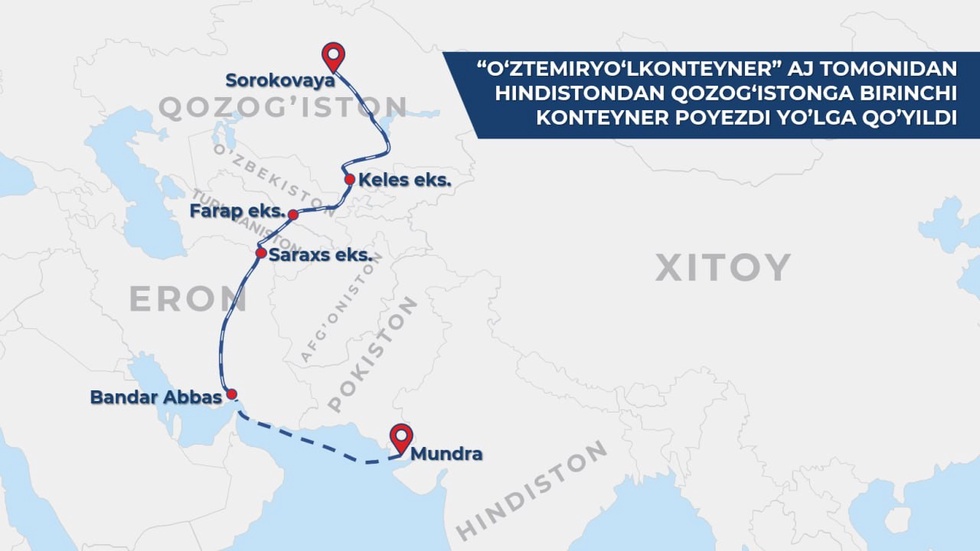 2024-yilda ushbu yoʻnalish boʻylab Hindistondan Oʻzbekistonga (Mundra – Sergeli) 20 ta yigirma futlik konteyner tashuvlari muvaffaqiyatli amalga oshirilgan edi.