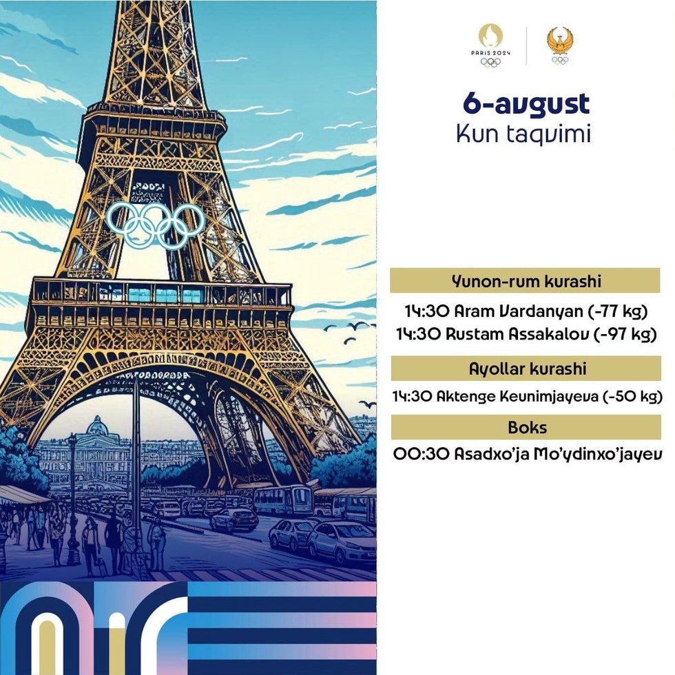 Bugun Parij-2024 yozgi Olimpiya oʻyinlari doirasida Oʻzbekiston delegatsiyasining 4 nafar sportchisi 3 ta sport turi boʻyicha qatnashadi.