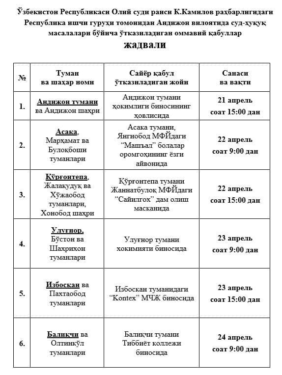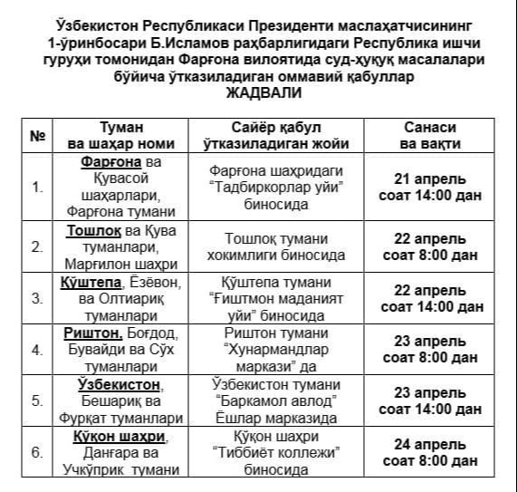 Oʻzbekiston Respublikasi Prezidenti maslahatchisining birinchi oʻrinbosari Baxtiyor Islamov rahbarligidagi ishchi guruhi Fargʻona viloyatida, Oliy sud raisi Kozimjon Kamilov rahbarligidagi ishchi guruhi Andijon viloyatida joriy yilning 21-24-aprel kunlari ish olib boradi.