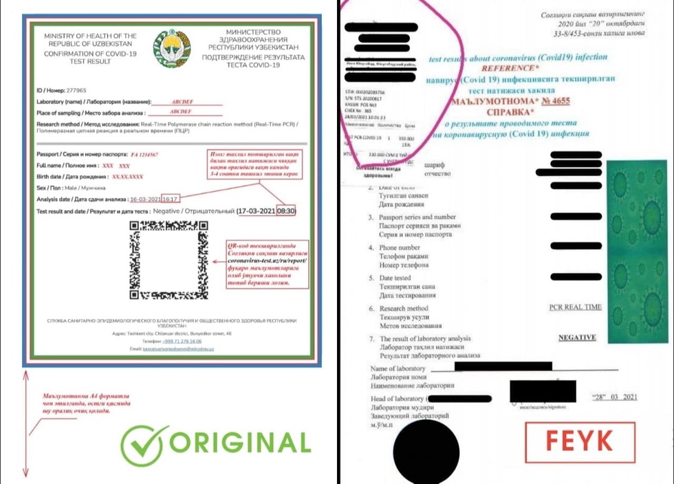 Aeroportda yoki qoʻshni mamlakatlar bilan chegaradosh hududlarda ushbu testlarning QR-kodlari tekshirilganda, qalbaki ekani aniqlanmoqda.