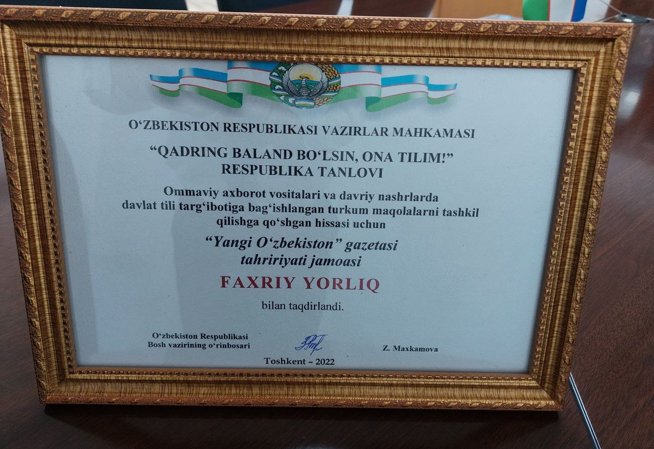 Quvonarlisi, Hakamlar hayʼati qarori bilan “Yangi Oʻzbekiston” gazetasi tahririyati jamoasi “Ommaviy axborot vositalari va davriy nashrlarda davlat tili targʻibotiga bagʻishlangan turkum maqolalarni tashkil qilishga qoʻshgan hissasi uchun” nominatsiyasiga loyiq koʻrildi.