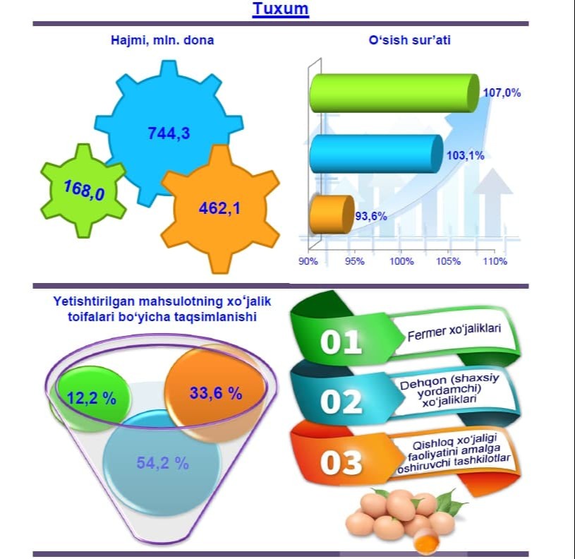 Davlat statistika qoʻmitasi maʼlumotlariga koʻra, 2021-yilning 1-choragi davomida respublikamizda 1 374,4 million dona tuxum yetishtirilgan. Bu oʻtgan yilning mos davriga nisbatan solishtirilganda oʻsish surʼati 100,2 foizga teng.