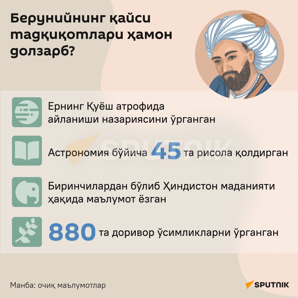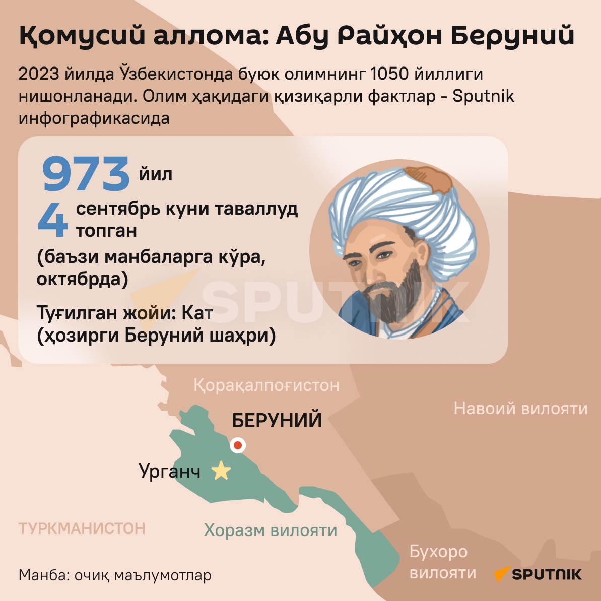 Abu Rayhon Beruniy 973-yilning 4-sentyabrida (baʼzi manbalarga koʻra 4-oktyabrda) Xorazmning qadimiy poytaxti — Katda (hozirda Qoraqalpogʻistonning Beruniy shahri) tugʻilgan va matematika hamda astronomiyaning rivojlanishiga ulkan hissa qoʻshgan.