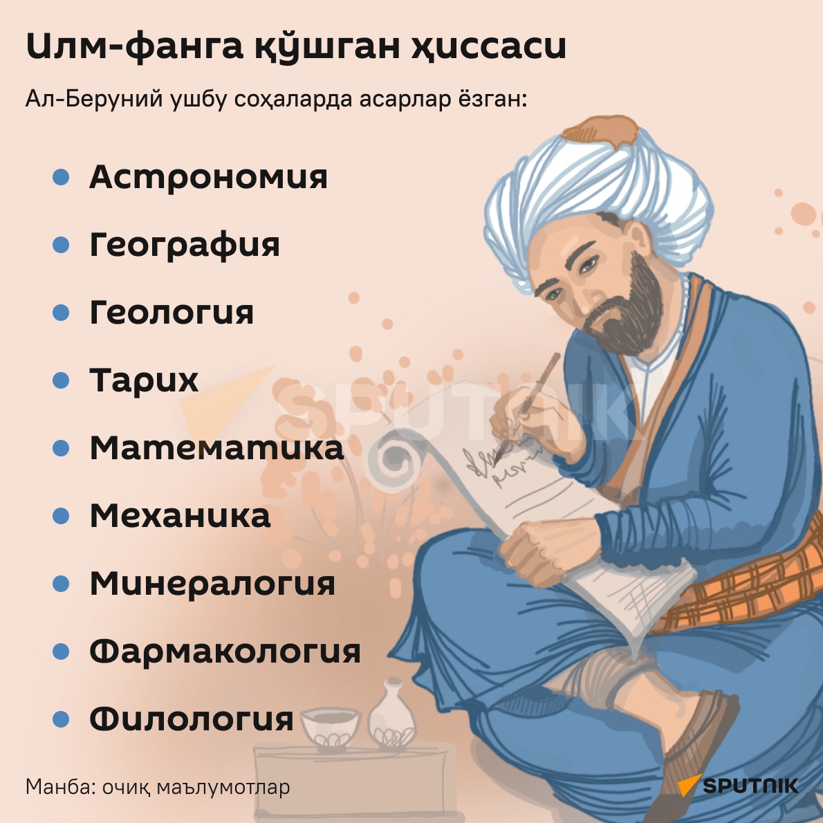 Oʻz davrining deyarli barcha fanlarini mukammal oʻrgangani sabab uni qomusiy alloma deb atashadi.