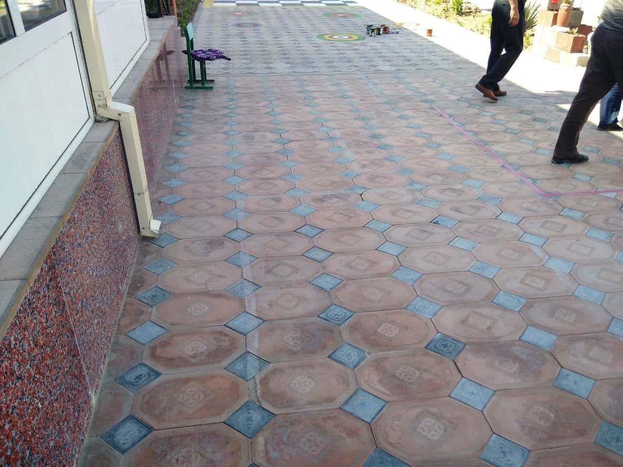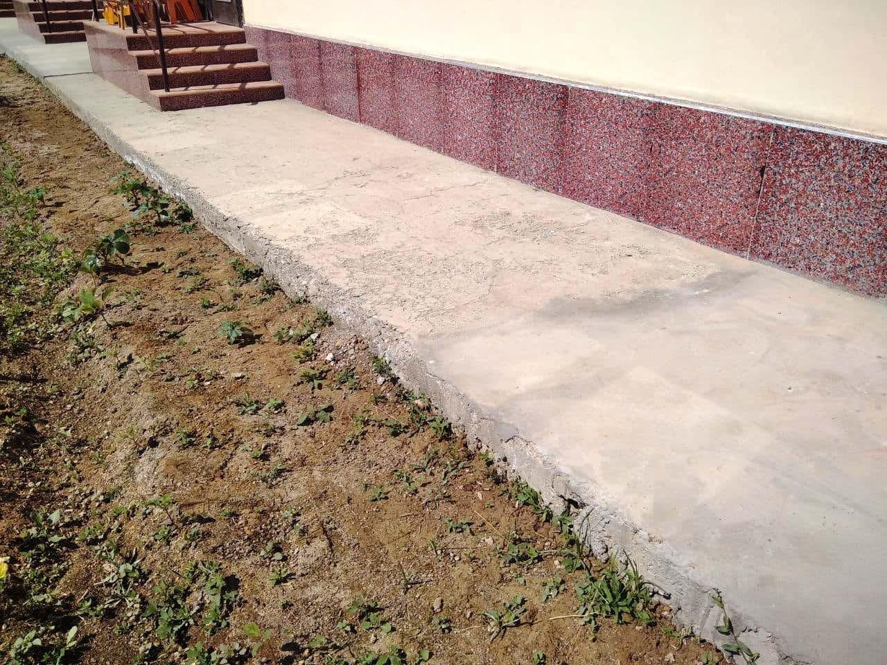 Bino atrofidagi sement yoʻlak chetlari yemirilib, ishning ham, sement mahsulotining ham sifatsizligidan dalolat berib turibdi. Yogʻingarchilik vaqtlarida aholi honadonlarining tomidan oqadigan yomgʻir va qor suvlari toʻgʻridan-toʻgʻri DMTT hovlisiga tushadigan qilib qoʻyilgan. Bino va qoʻshni hovlilar tomidan tushadigan suvlar DMTT hovlisiga — bolalar maydonchalariga, ekin maydonlariga kelib toʻplanadi va oʻz navbatida, binoga ham jiddiy zarar yetkazadi.