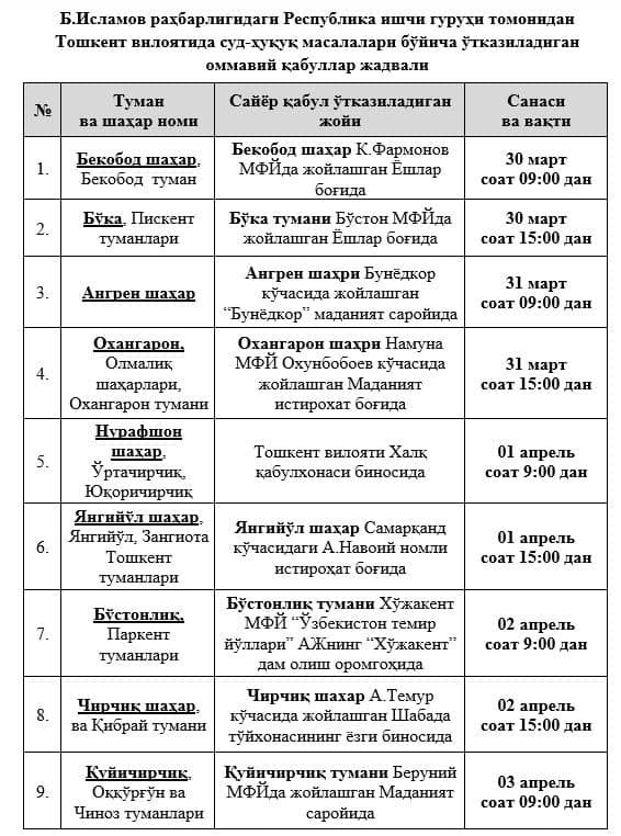 Oʻzbekiston Respublikasi Prezidenti maslahatchisining birinchi oʻrinbosari Baxtiyor Islamov va Oliy sud raisi Kozimjon Kamilov rahbarligidagi ishchi guruhlar joriy yilning mart-iyul oylari davomida Qoraqalpogʻiston Respublikasi, viloyatlar va Toshkent shahrida boʻlib, murojaatchilar bilan muloqot oʻtkazishadi.