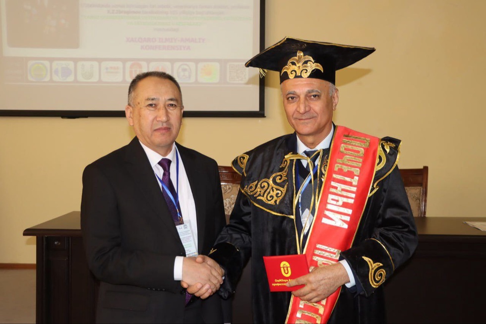 Samarqand davlat veterinariya meditsinasi, chorvachilik va biotexnologiyalar universitetida Oʻzbekistonda xizmat koʻrsatgan fan arbobi, veterinariya fanlari doktori, professor X.Z.Ibragimov tavalludining 105-yilligiga bagʻishlangan “YANGI OʻZBEKISTONDA VETERINARIYA TERAPIYASINING YUTUQLARI VA ISTIQBOLDAGI VAZIFALARI” mavzusidagi xalqaro ilmiy amaliy konferensiyada universitet rektori – biologiya fanlari doktori, professor, Oʻzbekiston Respublikasida xizmat koʻrsatgan chorvador Yunusov Xudaynazar Beknazarovichga Oʻsh davlat universiteti (Qirgʻiziston) “Fahriy professori” unvoni topshirildi.