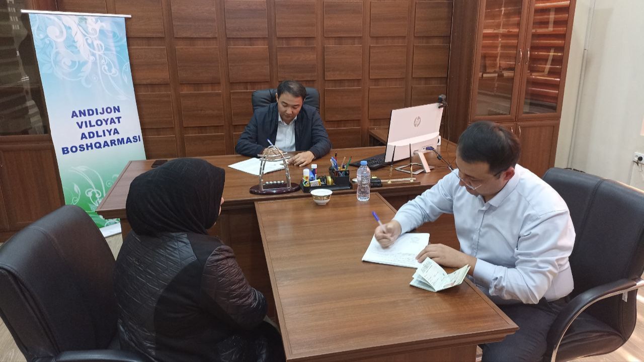 Anijon viloyat Adliya boshqarmasi tomonidan jami 43 ta fuqaro qabul qilindi. Shundan, 33 tasi joyida qanoatlantirildi. Misol uchun, fukaro S.Mamirjonova onasidan qolgan merosni rasmiylashtirish masalasida murojaat qilgan boʻlsa, G.Axrolova ancha yildan buyon 2016-yilda Toshkent shaxrida tugʻilgan qiz farzandiga tugʻilganlik guvoxnomasi ololmayotganligi boʻyicha murojaat qildi. Ularning masalasi oʻsha yerning oʻzida hal etib berildi.