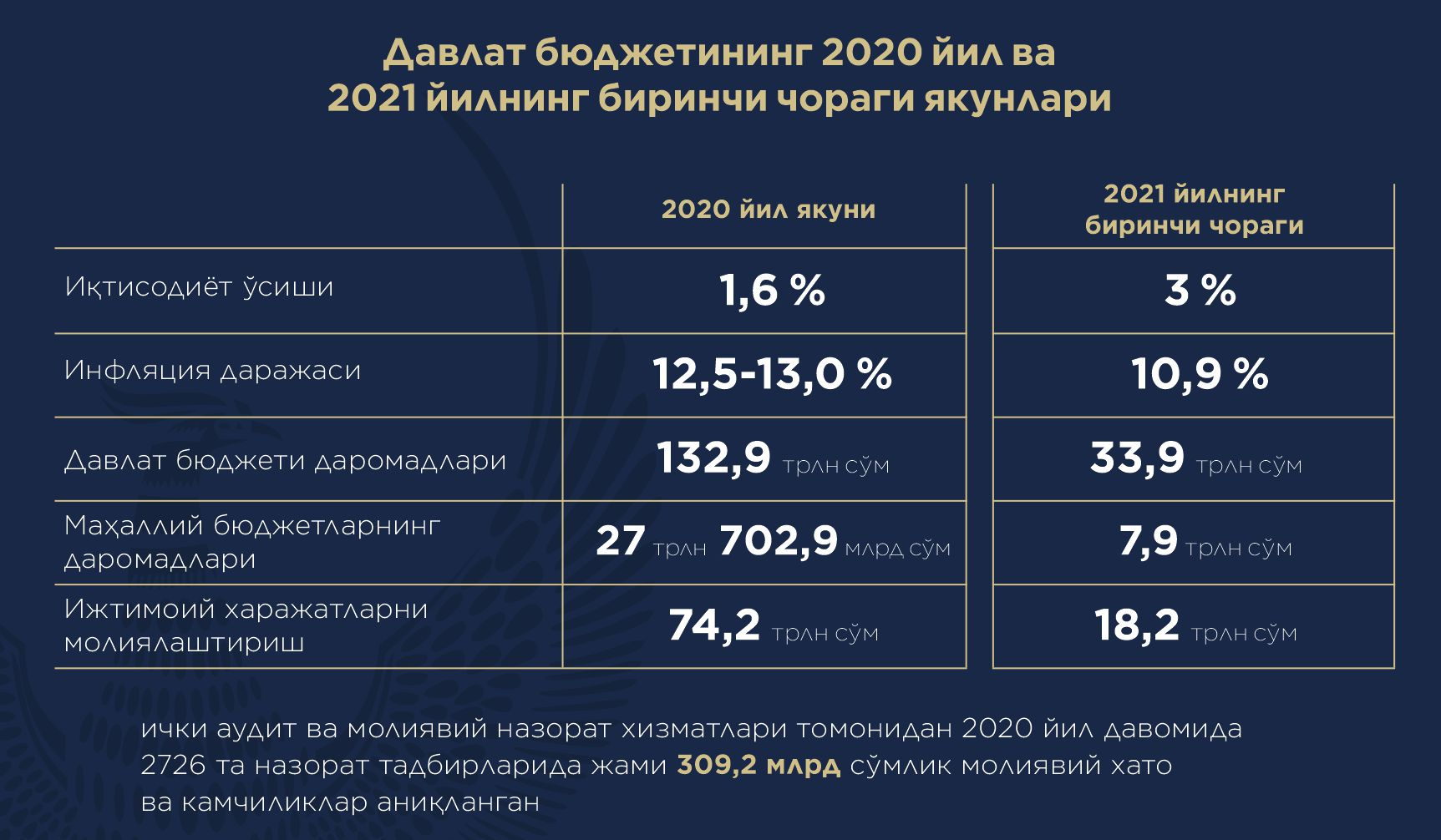 Taʼkidlangandek, karantin tadbirlari munosabati bilan respublikamiz iqtisodiyoti oʻsishi 2020-yil yakuni bilan 2019-yilga nisbatan 1,6 foizga sekinlashib, YAIM hajmi 580,2 trln soʻmni tashkil etgan. 2021-yilning I choragida YAIM oʻtgan yilning shu davriga nisbatan 3 foizga oʻsgan.