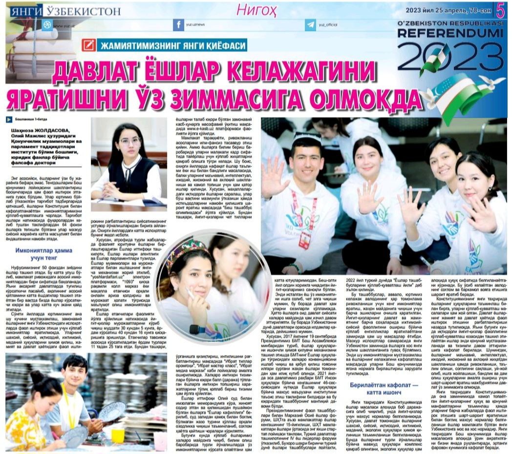 eng asosiysi, yoshlarning o'zi bu jarayonlarga befarq emas. Tengdoshlarim Bosh Qomusimiz loyihasini shakllantirish bosqichlarida ham faol ishtirok etganiga guvoh bo'ldim. Ular yurtimiz bo'ylab o'tkazilgan huquqiy targ'ibot tadbirlarida qatnashib, tengqurlarini, jamiki yoshlarni Konstitutsiya bilan kafolatlanayotgan imkoniyatlarimizni qo'llab-quvvatlashga chorladi. Amalga oshirilgan targ'ibot ishlari natijasida aholi tomonidan kelib tushgan 227 mingdan ziyod taklifdan 64 foizi yoshlarga tegishli bo'lgani ularning mazkur siyosiy jarayonga katta ma'suliyat bilan yondashayotganini namoyon etadi.