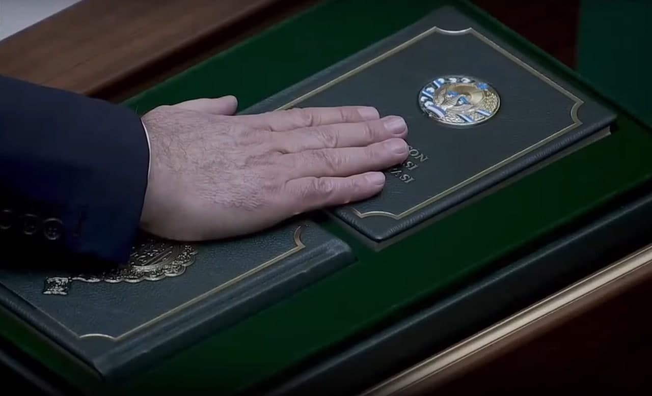 «O'zbekiston xalqiga sadoqat bilan xizmat qilishga, respublikaning Konstitutsiyasi va qonunlariga qat'iy rioya etishga, fuqarolarning huquqlari va erkinliklariga kafolat berishga, O'zbekiston Respublikasi Prezidenti zimmasiga yuklatilgan vazifalarni vijdonan bajarishga tantanali qasamyod qilaman».