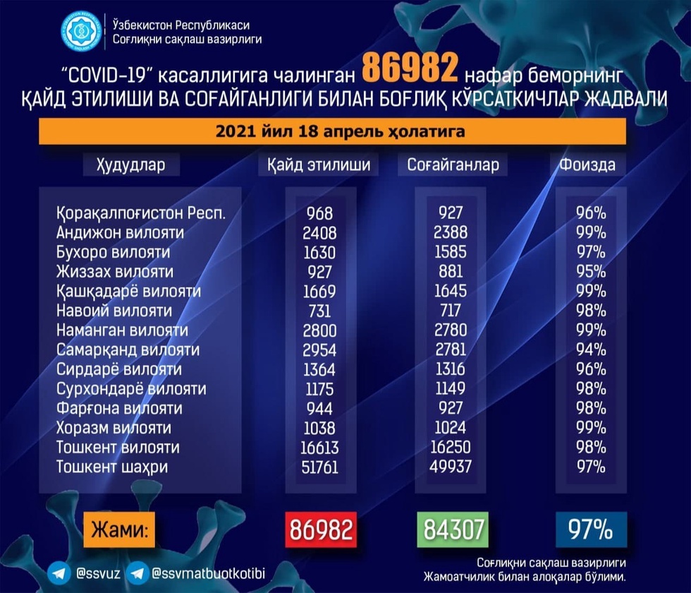 Toshkent shahrida 106 nafar bemor tuzalib, kasallikdan sogʻayganlar jami 84307 (+264) nafarga yetdi va sogʻayish koʻrsatkichi 97 foizni tashkil qilmoqda.