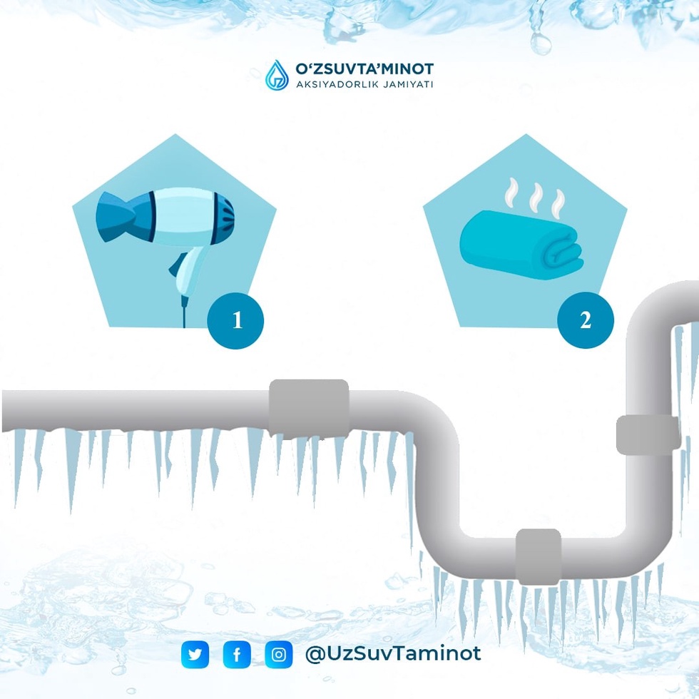 Quvurning ochiq muzlagan joyini latta yoki biror mato bilan o'rab, ustiga iliq issiq suv quying va suv haroratini sekin-asta oshirib boring. Kranni oching – bu muzning erishini tezlashtiradi. Namlangan lattalar esa issiqlikni bir muddat ushlab turadi, plastmassa yoki metall quvurlar ichidagi muzni eritishga imkon beradi.