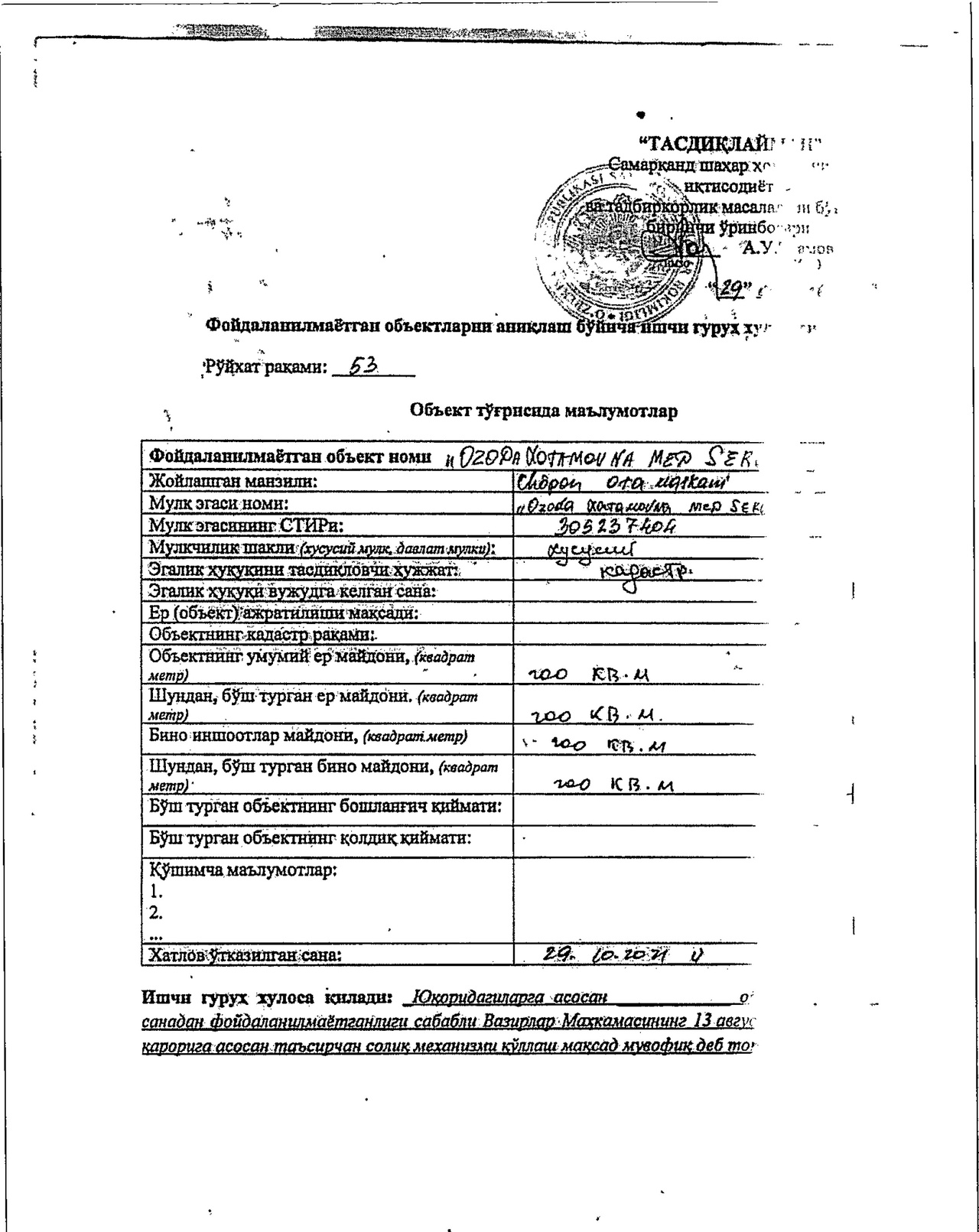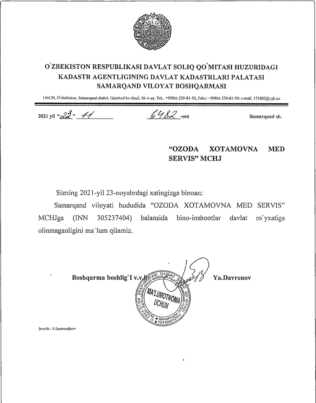 “Ozoda Xotamova Med Servis” MCHJning balansida bino-inshootlar davlat roʻyxatiga olinmagan. Davlat kadastrlar palatasi Samarqand viloyat boshqarmasi tomonidan taqdim etilgan maʼlumotda ham bu alohida qayd etilgan. Mazkur tadbirkorlik subyektiga qarashli deb eʼtirof etilgan obyektda xatlov oʻtkazilganda ham u tegishli tartibda uy-joyga oʻtkazilgani, shu bilan birgalikda fuqaro B.Ostonqulovga tegishli ekanligi aniqlangan.