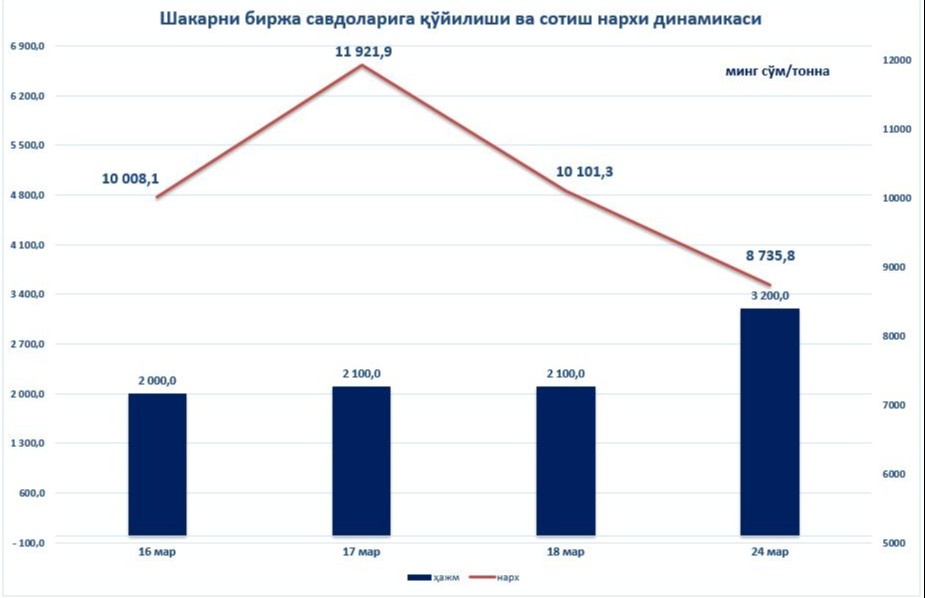 Xususan, 24-martda birja savdolariga jami 3 200 tonna shakar qoʻyilgan boʻlib, ulardan 2874 tonnasi, yaʼni 90 foizi sotildi. Bunda, birja savdolari orqali “Xorazm shakar” MCHJ tomonidan 1 600 tonna va “Angren shakar” MCHJ tomonidan 1 274 tonna shakar sotildi.