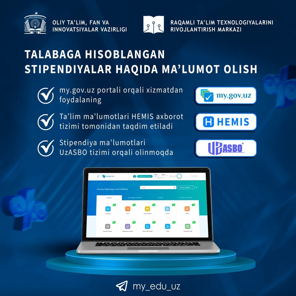 Oliy ta'lim, fan va innovatsiyalar vazirligi axborot xizmatining ma'lum qilishicha, my.gov.uz portaliga kirib, "Ta'lim" bo'limidan "Stipendiya haqida ma'lumot" xizmatini va kerakli davrni tanlash orqali ushbu davr bo'yicha hisoblangan stipendiyalar haqidagi ma'lumotga ega bo'lish mumkin.