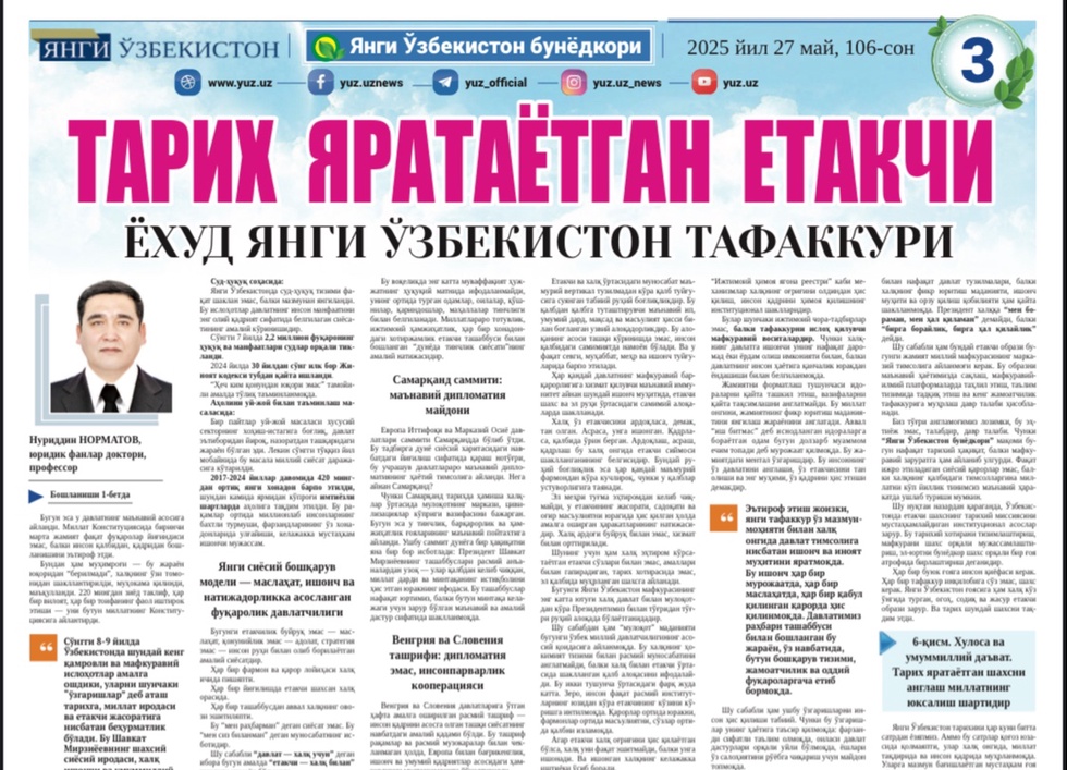Yangi Oʻzbekiston tarixini har kuni bitta satrdan yozyapmiz. Ammo bu satrlar qogʻoz yuza sida qolmayapti, ular xalq ongida, millat taqdirida va inson qadrida muhrlanmoqda. Ularga mazmun bagʻishlayotgan mustahkam gʻoya uygʻoq tafakkur va xalq bilan nafas oluvchi yetakchi obrazidir.