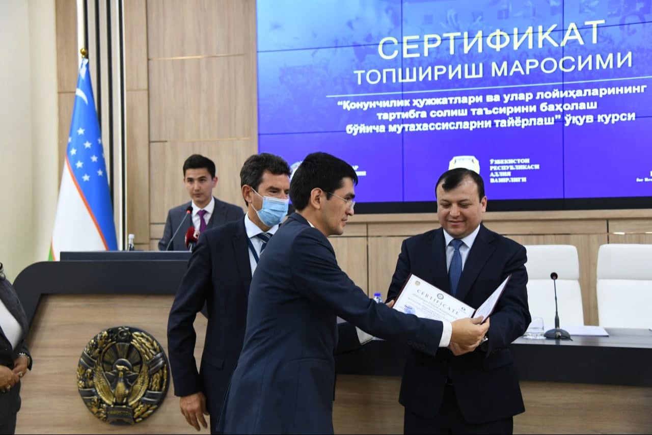Shu bois, joriy yilning avgust-sentyabr oylarida Adliya vazirligi tomonidan Yevropa tiklanish va taraqqiyot banki bilan hamkorlikda Tartibga solish taʼsirini baholash boʻyicha maxsus oʻquv kurslari vazirlik va idoralarning, shuningdek mahalliy ijroiya hokimiyati organlari xodimlari uchun tashkil etildi. Oʻquv kurslarini sifatli va yuqori saviyada tashkil etish maqsadida mazkur sohada boy amaliy tajribaga ega boʻlgan milliy va xalqaro ekspertlar, jumladan, Yevropa xavfsizlik va hamkorlik tashkiloti Akademiyasi professorlari jalb etildi.