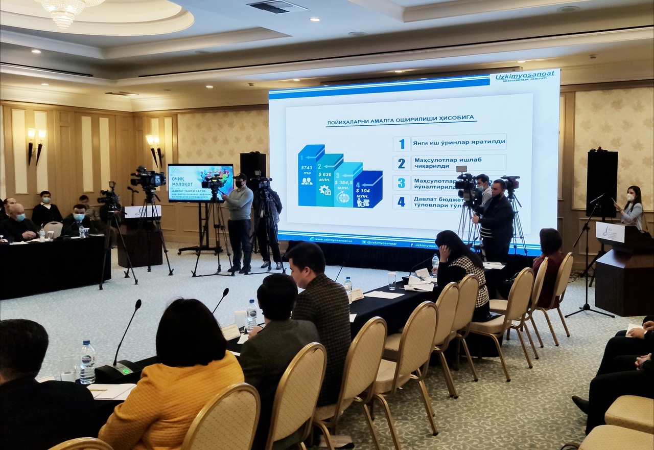 Brifingda “Oʻzkimyosanoat” AJ boshqaruvi raisi J.Mirzamahmudov kimyo sanoatini rivojlantirish uchun davlatning tashqi qarzi hisobidan ajratilgan mablagʻlardan samarali foydalanish boʻyicha amalga oshirilgan ishlar toʻgʻrisida maʼlumot berdi. Jumladan, “Oʻzkimyosanoat” AJ tizimi korxonalarida tashqi qarz mablagʻlarni jalb qilish hisobiga umumiy qiymati 2,4 mlrd dollarga teng boʻlgan 7 ta investitsiya loyihasi amalga oshirilgan.