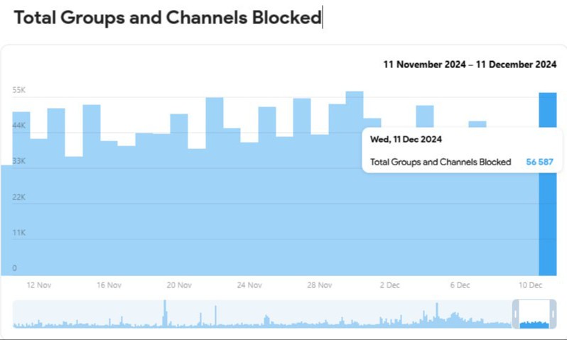 Telegram platformasi har kuni foydalanish qoidalariga zid boʻlgan kontentga qarshi choralar koʻrishda faoliyat yuritmoqda. Kompaniya maʼlumotlariga koʻra, oʻn minglab kanal va guruhlar bloklanib, millionlab zararli kontentlar oʻchirilmoqda.