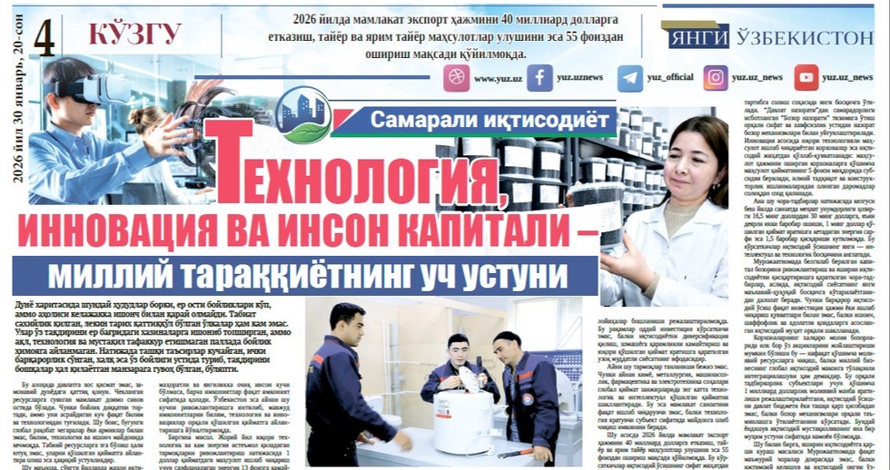 Shu asosda 2026-yilda mamlakat eksport hajmini 40 milliard dollarga yetkazish, tay­yor va yarim tayyor mahsulotlar ulushini esa 55 foizdan oshirish maqsadi qoʻyilmoqda. Bu koʻr­satkichlar iqtisodiy oʻsishning sifat jihatdan oʻzgarishini anglatadi. Yaʼni eksport hajmini oshirish endi faqat miqdor bilan emas, balki mahsulotning texnologik murakkabligi va bo­zordagi raqobatbardoshligi bilan belgilanadi.
