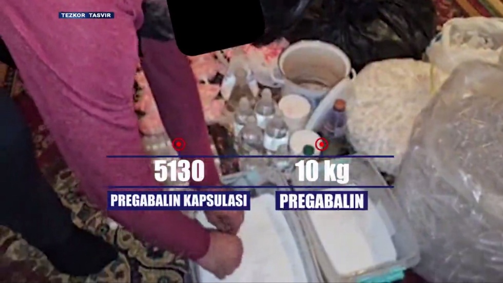 Tekshiruv natijasida uning uyi va avtomashinasidan 16 227 dona “Pregabalin”, 7 947 dona “Regapen”, 35 dona “Lirika” va 14 dona “Perge” — jami 24 223 dona kuchli taʼsir qiluvchi dori vositalari olindi.