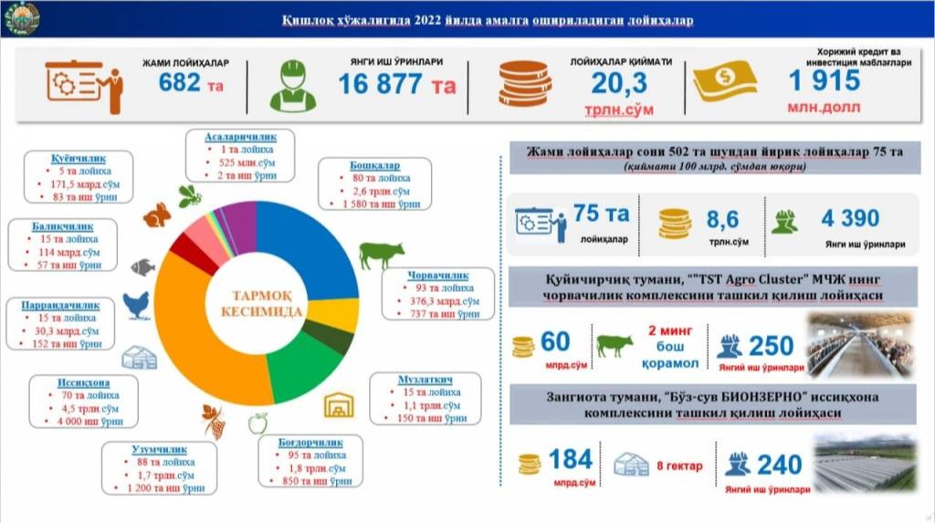 Prezidentimizning 2022-yil 28-yanvardagi “2022-2026-yillarga moʻljallangan Yangi Oʻzbekistonning strategiyasi toʻgʻrisida” gi farmoni ijrosi doirasida belgilangan vazifalar va maqsadlar asosida Toshkent viloyatining qishloq xoʻjaligi tarmoqlarida keng koʻlamli ishlar qilinadi. Qayd etilganidek, Prezidentimizning 2021-yil 23-noyabrdagi “Meva-sabzavotchilik va uzumchilikda oilaviy tadbirkorlikni rivojlantirish, qishloq xoʻjaligi ishlab chiqarishida dehqon xoʻjaliklarining ulushini oshirish chora-tadbirlari toʻgʻrisida” gi qaroriga asosan tumanlarda paxta va gʻalla maydonlarini qisqartirish hisobiga dehqon xoʻjaliklari tashkil etish va bu yilgi hosil uchun qishloq xoʻjaligi ekinlarini joylashtirish koʻrsatkichlarini oshirish kutilmoqda.
