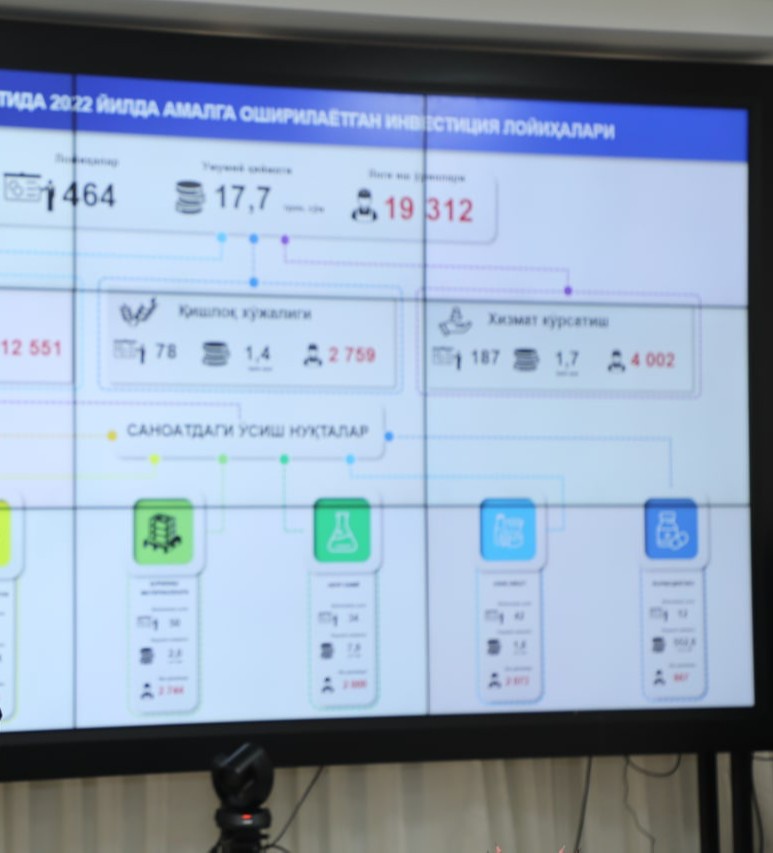 Xususan, investitsiya sohasida joriy yilda 464 ta, umumiy qiymati 17,7 trln. so'mlik loyihalar amalga oshirilishi natijasida 20 mingga yaqin ish o'rinlari yaratish bo'yicha sa'y-harakatlar olib borilmoqda.
