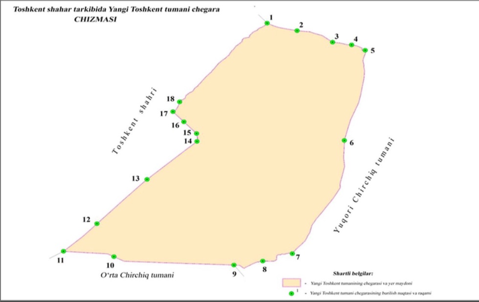 Toshkent viloyati hududidan 19 729,41 gektar, shu jumladan Yuqori Chirchiq tumanidan 17 323,32 gektar, Oʻrta Chirchiq tumanidan 2 406,1 gektar yer maydonlari Toshkent shahrining Yangi Toshkent tumani tarkibiga oʻtkazildi.