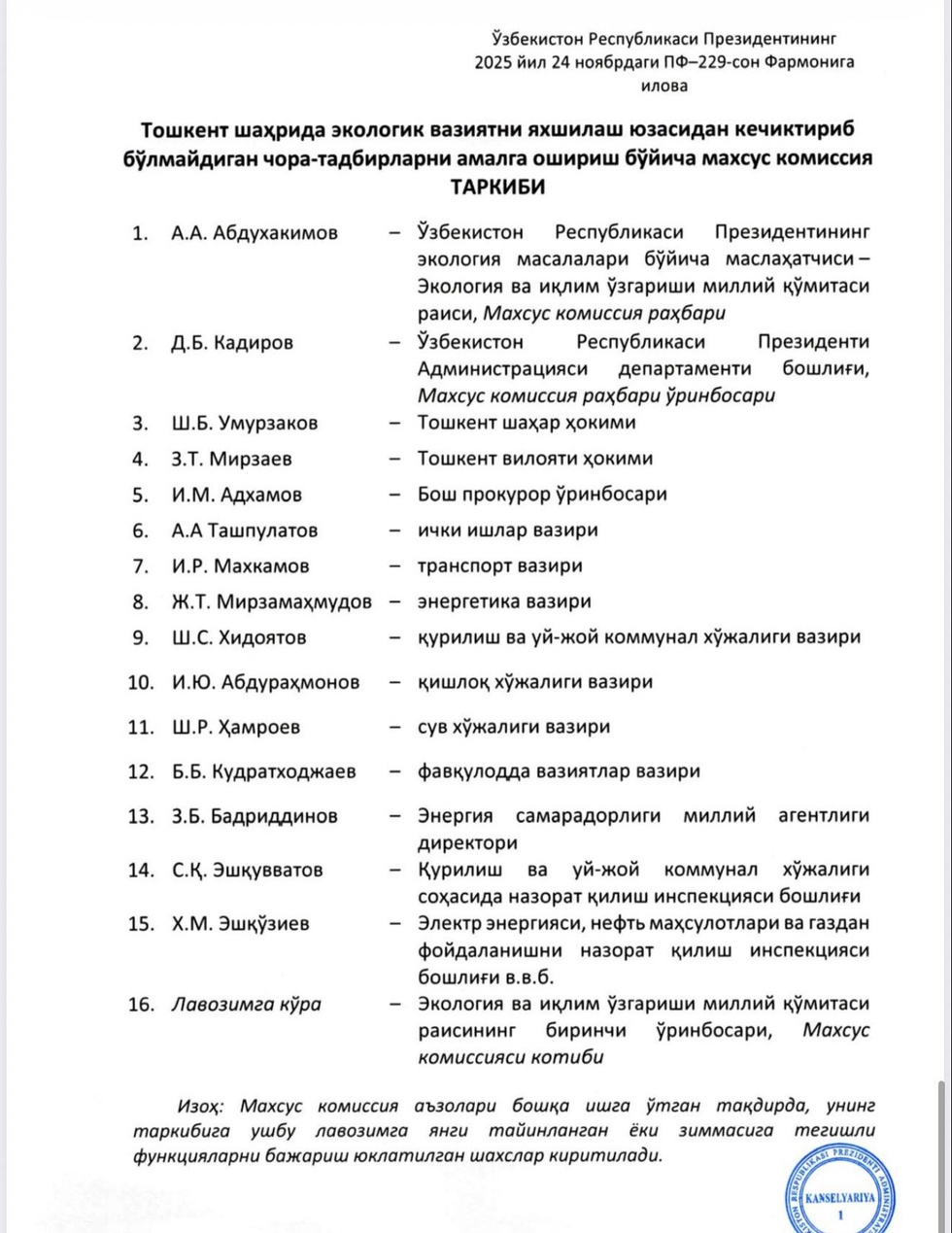 Ekologik vaziyatni yaxshilash yuzasidan tuzilgan maxsus komissiyaga quyidagi vakolatlar berildi: